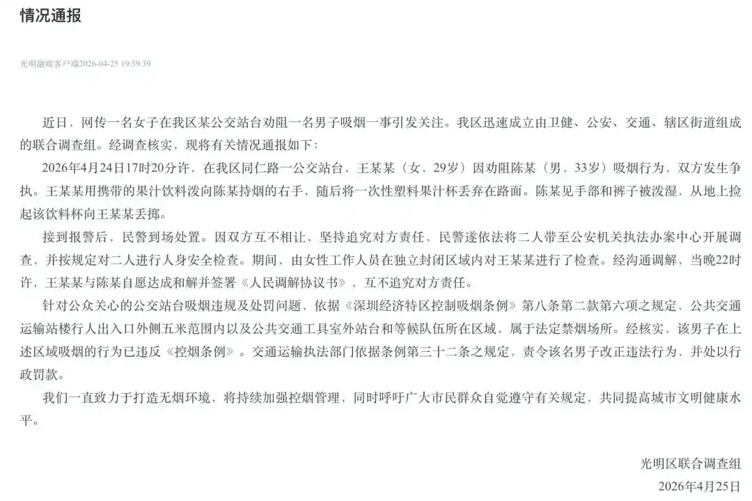 深圳公交站的禁止吸烟标识相关检查符合规定记者留意到,此事的焦点问题之二,是警方的执法是否存在瑕疵?记者了解到,事发后,光明区迅速成span class="bjh-br"/>记者了解到,民警到场处置,因双方坚持追究对方责任,民警依法将二人带至公安机关执法办案区开展调查。根据规定,为防范可能发生的意外,涉事人员进入公安机关执法办案区,需接受人身安全检查。对王某某,警方安排了女性工作人员在独立封闭区域内对其进行了检查。记者向法律界人士咨询,警方执法过程合法合规。法律界人士:可善意提醒或留证举报 切勿私力强制制止此事在社交媒体引发关注和讨论。大家认为,涉事男子在公共场合尤其是禁烟区域吸烟,此行为本来就不对且违反法规,市民予以劝导属热心之举,但过程中,王某某的行为也有冲动过激之嫌。此事也引发法律界人士广泛讨论。广东晟典律师事务所高级合伙人毛鹏律师强调,普通市民若善意劝阻无效,最合理、合法的处置方式是留存证据,向对应行政执法部门求助,由专业行政人员依法处置,而非自行采取泼水、争执、阻拦等强制手段。即便市民出发点是制止不文明违规行为,一旦私自采取强制干预手段,对他人造成干扰、冲突,原本占理的一方反而会陷入被动,甚至可能触犯治安管理相关法律法规。来源:中国青年报、光明区联合调查组、深圳特区报 版权归属原作者 如有侵权请联系删除责编:麻文静 审核:王世洋 终审:娄恒推荐阅读1.注意防范!河南天气将大反转,多地迎雷暴大风2.大连8岁男孩爬山发现金矿线索!后续来了→3.开封府“廉”播上线!知识点“包”你看不够4.事关老年人、骑行爱好者!12306,有新优惠
